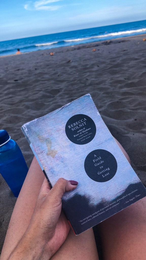 I’m lying on a cushioned sofa inside a wooden cabin in Montezuma, Costa Rica. A storm is raging and heavy drops of water that find their way inside reach my feet. Everything is quite wet: the wooden logs that form a roof let the water in, the cushions I lay on are damp and my hair, I feel, has not been completely dry in days. The book I’m holding with both hands has doubled its size and is now a container of sand and seawater. There is no phone signal or wifi here, there’s no one in sight, just me and my sadly damaged copy of Rebecca Solnit’s A Field Guide to Getting Lost.